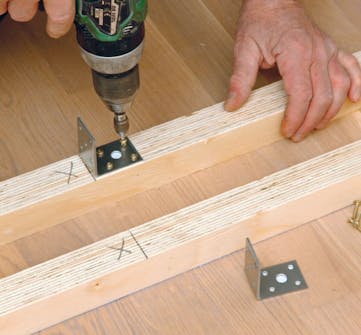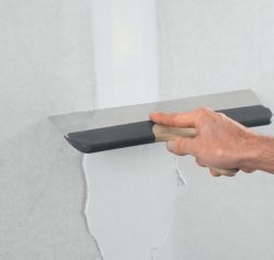Aloita toinen kerros puolikkaalla levyllä, jotta saumakohdat limittyvät. Käännä viistetyt reunat seinää kohti. Käytä 45 mm:n ruuveja ja sijoita ne 20 cm:n välein reunoilla ja 30 cm:n välein keskellä levyä.