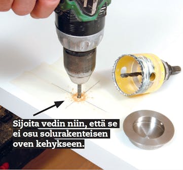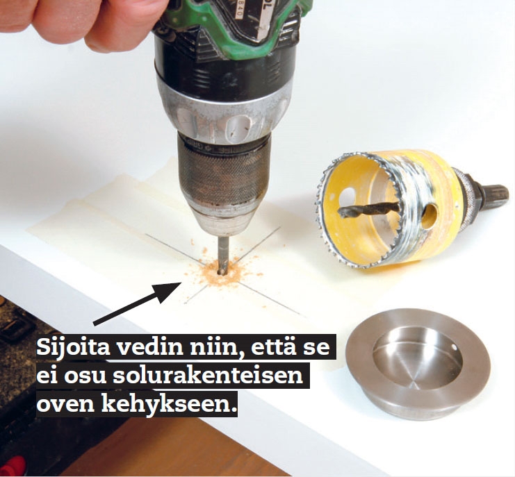 Esiporaa kuppivetimille reiät. Kiinnitä keskelle ovea (korkeussuun-nassa) pätkä maalarinteippiä ja merkitse oveen veti mien paikat. Poraa oven läpi. Pora vastaa reikäsahan kärkipiikkiä.