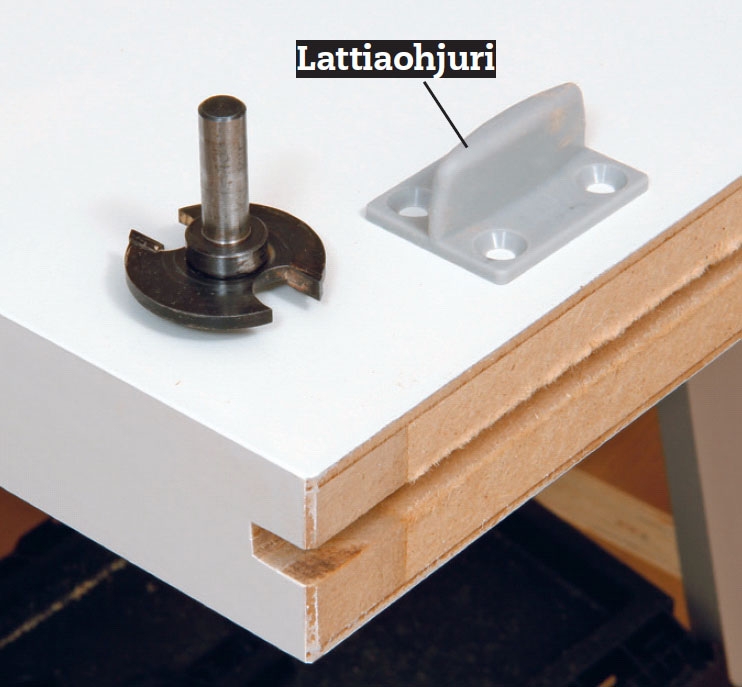 Tee ovilevyn alareunaan ura. Ura on pari millimetriä lattian ohjuria leveämpi. Ura tehdään kuvassa nähtävällä kiekkojyrsinterällä, joka asennetaan yläjyrsimeen.