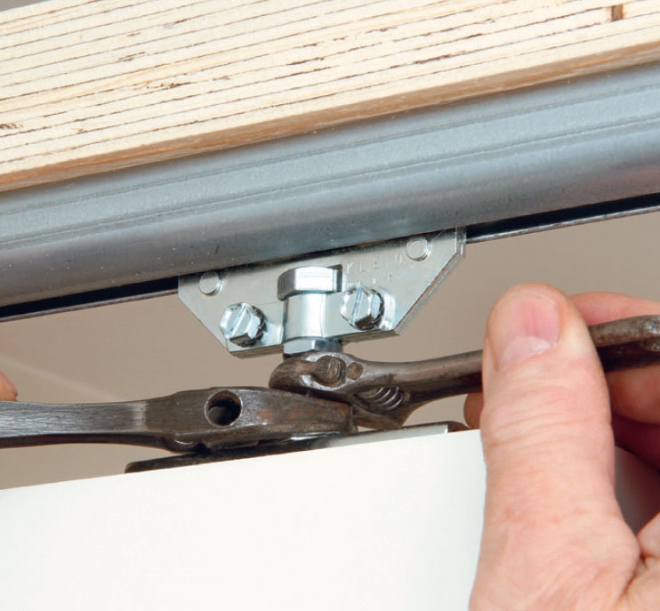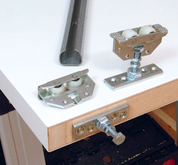 Kiinnitä pyöräsarjan toinen osa oven yläreunaan. Jokainen pyöräsarja koostuu kahdesta osasta, joita voi säätää suhteessa toisiinsa. Takana näkyy kisko, jossa pyörät kulkevat.