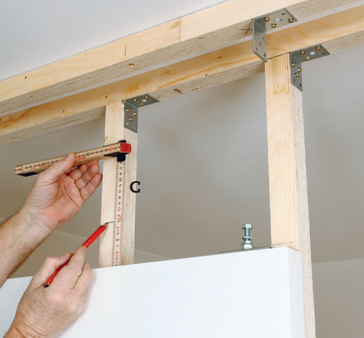 Aseta tolpat (C) puristuksiin katon ja lattian väliin. Sijoita ne molemmin puolin oviaukkoa. Oikaise ne pystyyn ja kiinnitä lattian palkkeihin kulmaraudoilla ja 4 x 30 mm:n ruuveilla.