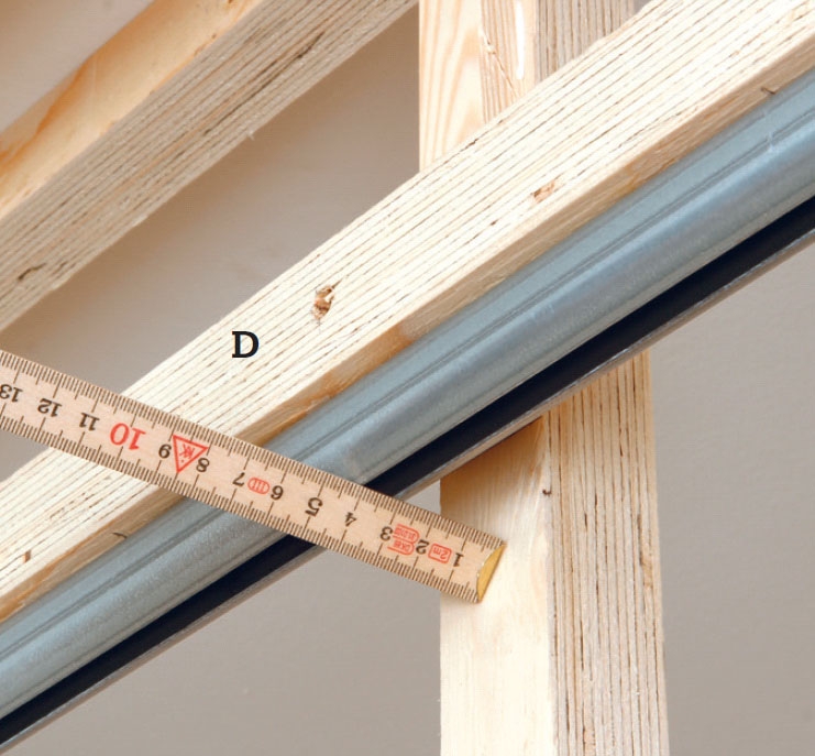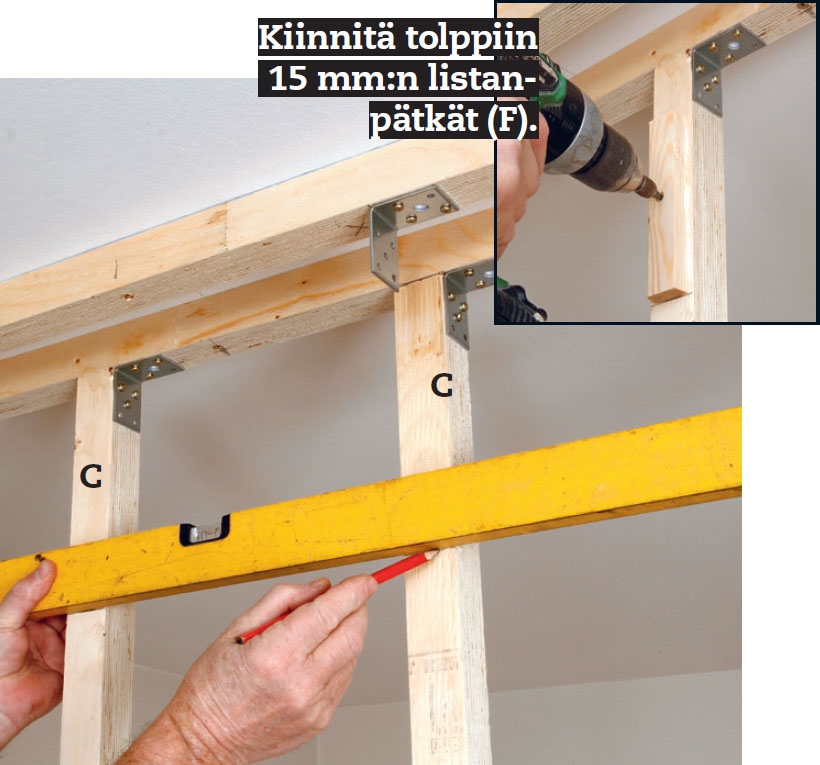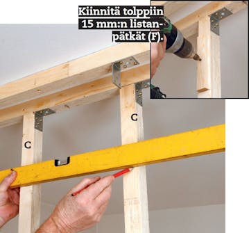Jotta palkki saadaan keskelle 7 cm le veää välitilaa, tolppien (C) ulkopintaan liimataan ja ruuvataan 15 mm pak su lista (F), ennen kuin palkki kiinnitetään.