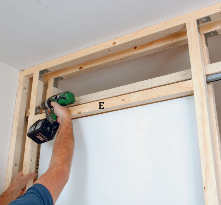 Asenna palkit (E) oviaukon yläreunaan molemmille puolille. Palkin alareunan tulee olla samassa tasossa ovilevyn yläreunan kanssa. Kiinnitä palkki kulmaraudalla ja ruuveilla.
