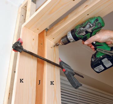 Kiinnitä 21 x 91 mm:n laudat (K) palkkeihin (E). Laudat on sahattu niin, että ne sopivat oviaukon päälle. Pitele niitä pystylistaa (J) vasten ja kiinnitä ne. Kiinnitä pystylaudat (K) ovilevyn molem-mille puolille myös vastakkaisella sivulla.