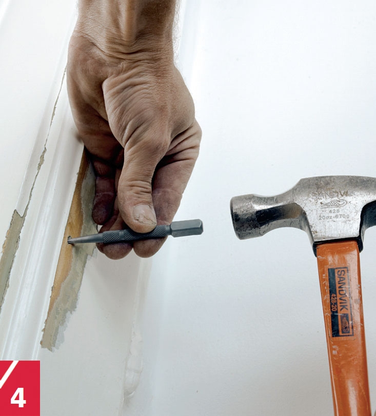 Vedä terävällä veitsellä viilto kehyslistan ja karmin sekä seinän rakoon. Näin maali ei murru, kun irrotat kehyslistaa. Tämä on järkevää, jos listoja käytetään uudelleen.