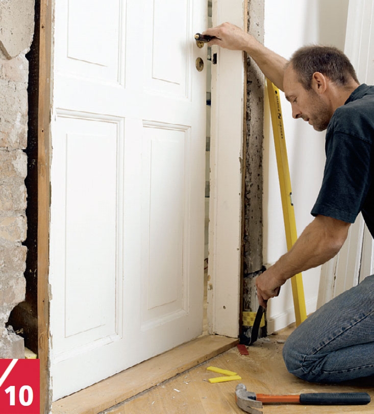 Karmin voi nyt irrottaa. Poista kaikki naulanpätkät sekä karmeista että seinistä, jotta karmin voi kääntää ympäri ja sovittaa uudelleen oviaukkoon.
