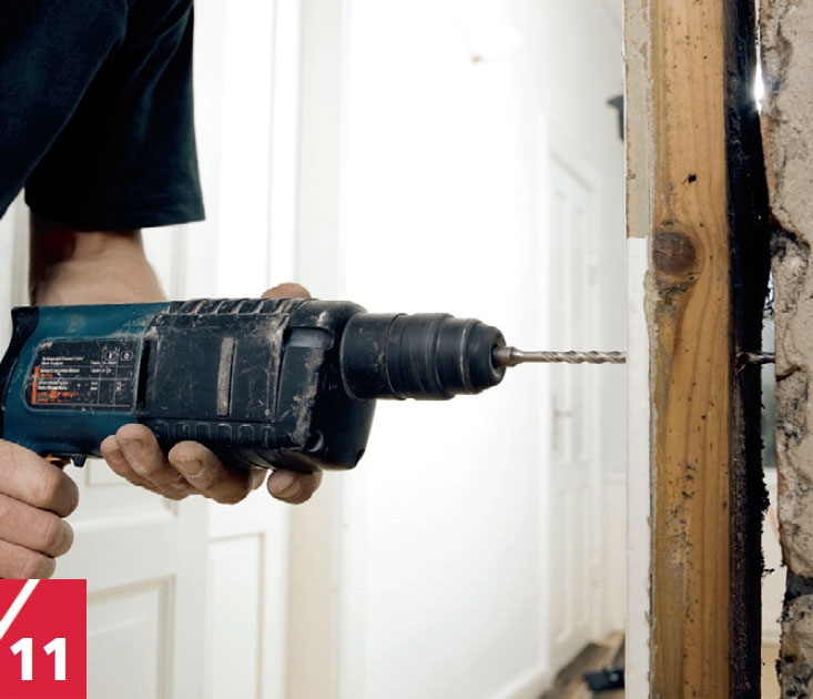 Ruuvaa saranapuoli seinään karmiruuveilla. Ruuveille on porattava ehkä uusia reikiä tai avarrettava entisiä. Karmi tuetaan kiiloilla seinää vasten aivan ruuvien vierestä.