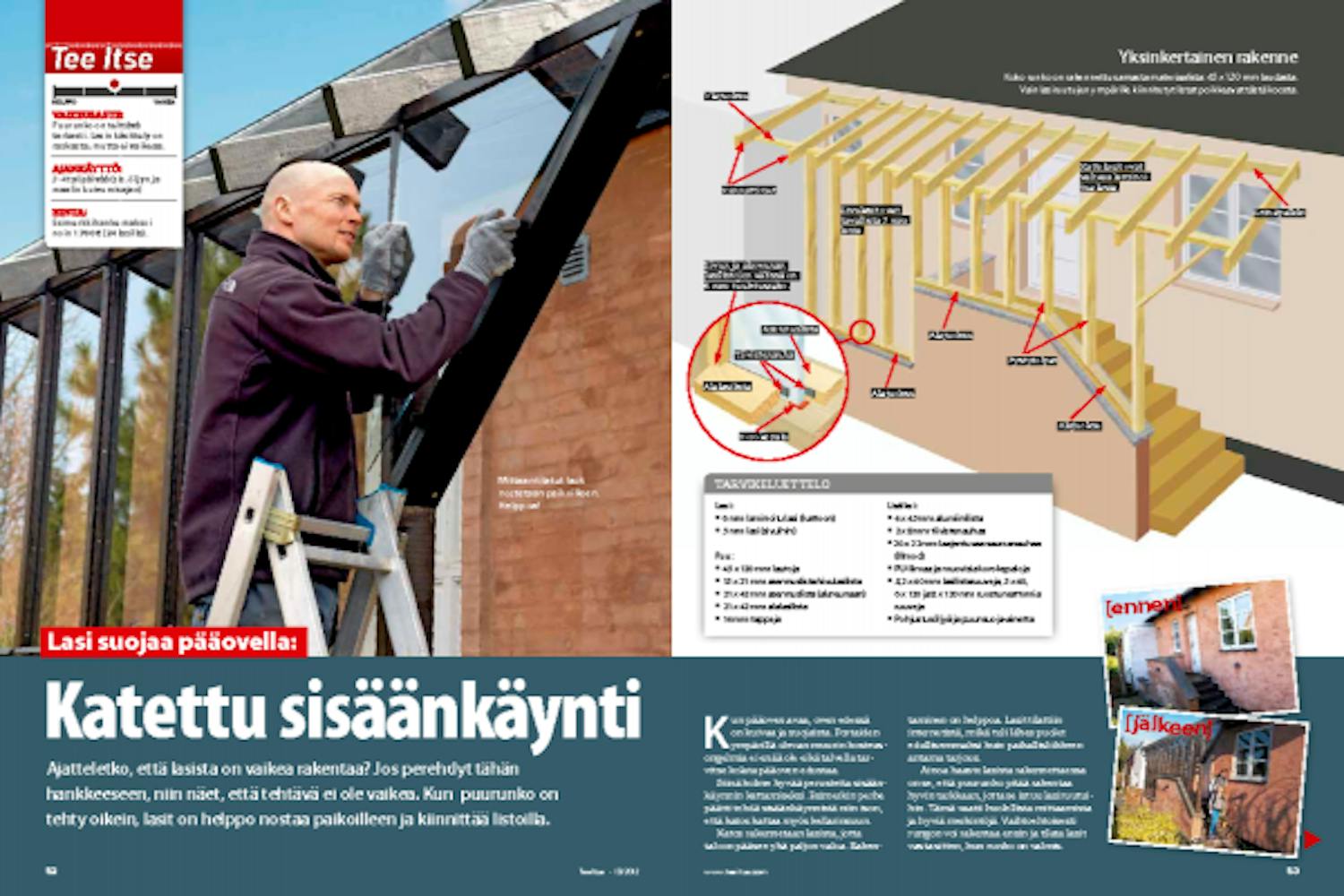 Sisäänkäynnin katon pitäisi olla turvalasia, joka ei sirpaloidu, jos se rikkoutuu. Esimerkissä käytetään 6 mm laminoitua lasia. Se koostuu kolmesta kerroksesta: 3 mm lasia, kirkas 0,38 mm kalvo ja toiset 3 mm lasia. Koska lasit on liimattu kalvon molemmin puolin, koko rakenne toimii kuten turvalasi.