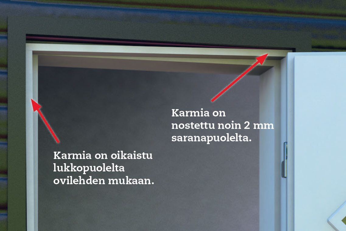 Ovikarmin ympärys on eristettävä. Tämän takia oven pitää olla pienempi kuin aukko, johon se asennetaan.