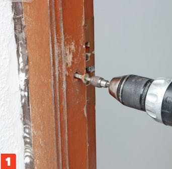 Ruuvaa karmi irti ja yritä saada irti niin monta ruuvia kuin pystyt. Tarkista ennen vanhan oven irrottamista, että uusi ovi sopii oviaukkoon.