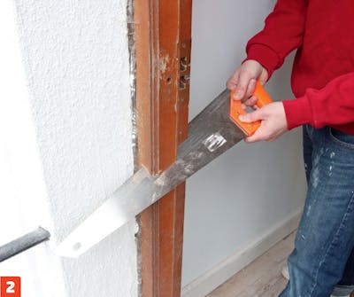 Pura karmi varovasti, jotta oviaukko pysyy mahdollisimman ehjänä. Se helpottaa viimeistelyä, kun uusi ovi on paikallaan.