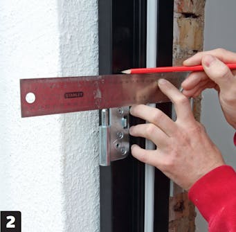 Nosta karmi oviaukkoon ja merkitse karmiruuvien paikat, jos karmissa ei ole valmiita ruuvinreikiä.