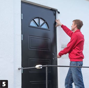 Asenna karmi oviaukkoon ja kiinnitä karmi lukkopuolelta. Sulje ovi ja tarkista, että joka puolella on yhtä isot raot. Sen jälkeen voit ruuvata karmin kiinni lukkopuolelta.