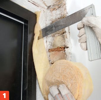 Paina karmin ja seinän väliin kaistale mineraalivillaa. Älä paina villaa liian tiiviiksi, jotta se eristää lämpöä. Muista myös jättää tilaa saumanauhalle ja tasoitteelle.