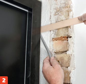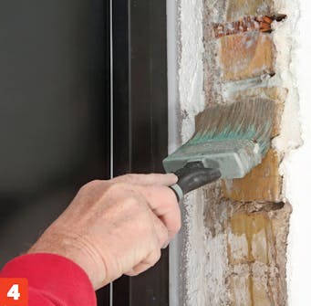 Poraa molemmille puolille neljä reikää. Kohdista reiät tiilten keskelle, sillä ruuvit eivät tartu laastisaumoihin. Poraa reiät 14 millin terällä.