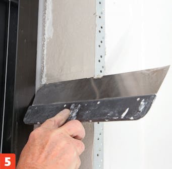 Purista saumamassa rakoon. Suojaa karmin reuna maala rinteipillä, jotta massa ei sotke ja naarmuta sitä. Liimaa teippi millin päähän karmin reunasta, jotta saat vedettyä teipin helposti irti. Tasoita massaa saumaustikulla ja irrota teippi heti, kun olet valmis.
