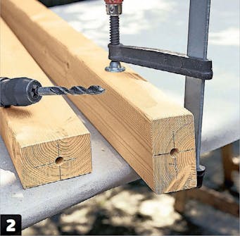 Pane kiila palkin (A1) alle. Poraa palkkiin reikä 40 millin terällä. Käytä apuna pylväsporakonetta tai porakonetelinettä, jotta reiän kulma sopii lankulle (A2).