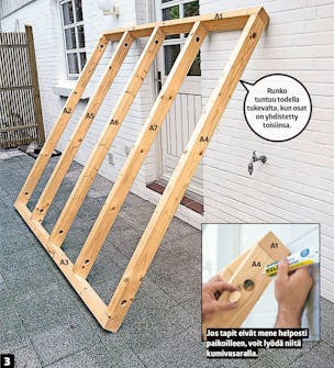 Nosta runko paikalleen työkaverin kanssa ja asenna kaksi väliaikaista tukilautaa puristimien avulla, jotta runko pysyy pystyssä. Merkitse palkkeihin (A4 ja A2) tolppien (B3 ja B2) paikat.
