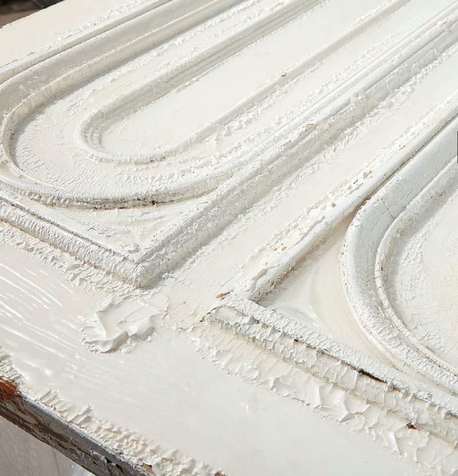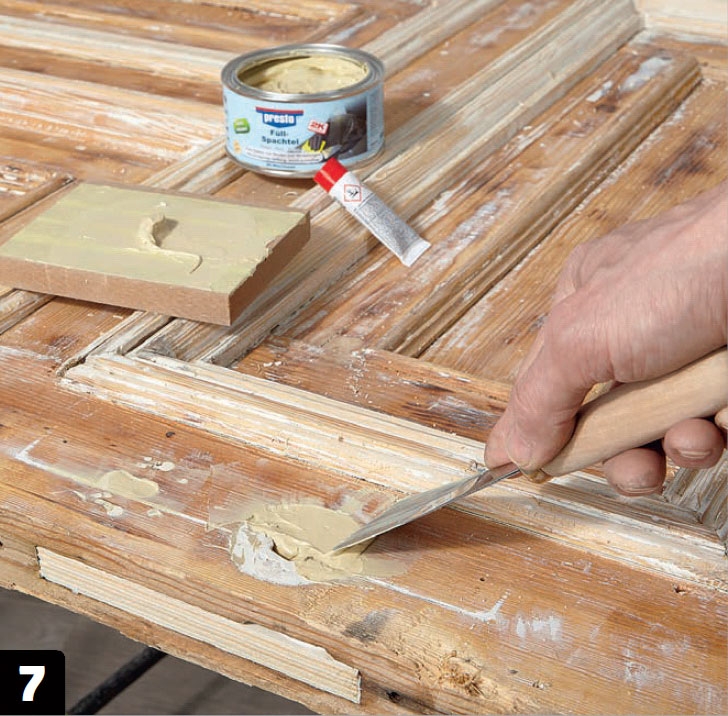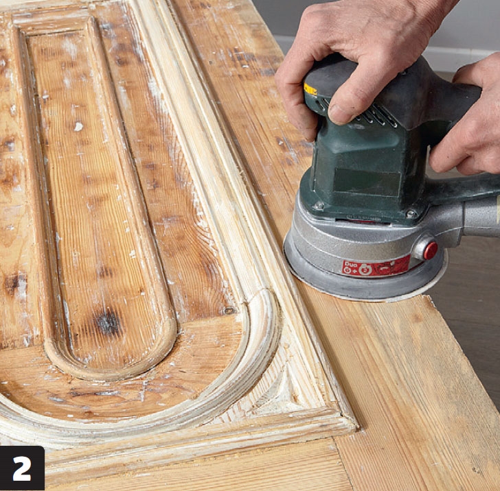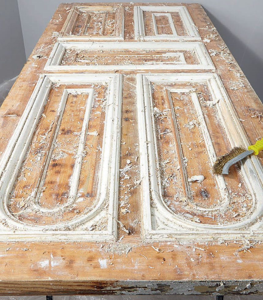 Tässä vaiheessa kannattaa henkäistä hetki ja katsoa, miltä ovi näyttää. Isojen pintojen kaapiminen on melko nopeaa, ja loput on helppo hioa pois epäkeskohiomakoneella. Sen sijaa koristeleikkausten puhdistaminen on hidasta. Työssä kannattaa pitää taukoja, jotta kädet eivät väsy liikaa. Varaudu siihen, että koristeiden hiominen vie aikaa.