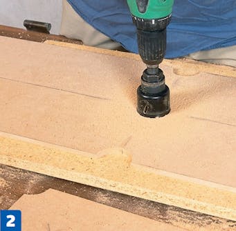 Poraa keskelle reikä. Aseta reikäsahan keskityskärki tarkasti levyjen väliseen nurkkaan. Kääntele levyjä ja poraa keskeltä, kunnes kaikissa nurkissa on samanlainen kolo.