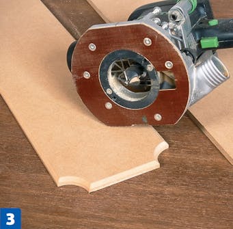 Sahaa peileihin tarvittavat levynpalat MDF-levystä. Tee pyöreät nurkat reikä-sahalla ja viistä reunat yläjyrsimellä. Asenna levyjen ympärille koristelistat.