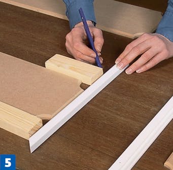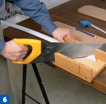 Sahaa koristelistat viistossa kulmassa, jotta niiden liitoksista tulee siistit. Tässä käytetään jiirilaatikkoa ja käsisahaa, mutta työ sujuu nopeammin jiirisirkkelillä.