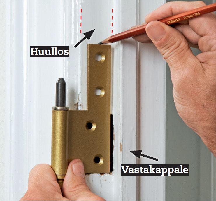 Ripusta oven sarana väliaikaisesti karmin saranaan, jotta voit merkitä, mihin kohtaan sarana tulee oveen. Vedä merkkiviiva siihen, missä saranan kaksi osaa kohtaavat toisensa (kuten kuvassa).