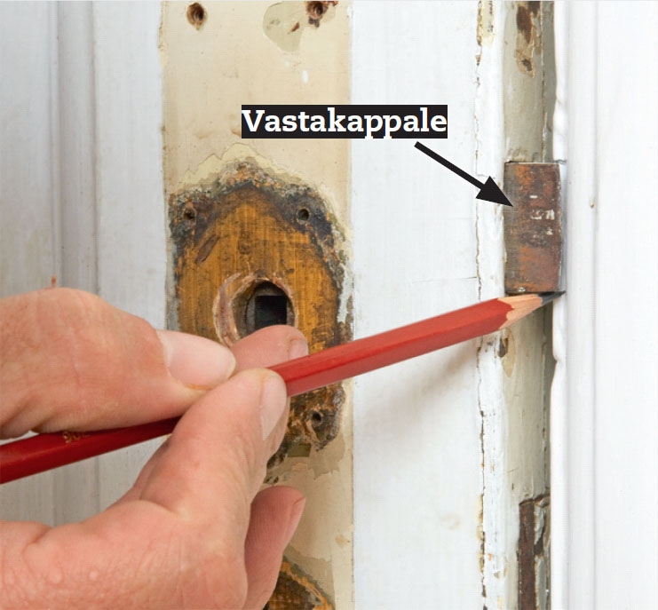 Huomioi, että rintalevyn isompi reikä vaatii isomman reiän myös karmiin, jotta telki ei ota vastaan. Tästä selviää helposti kapealla taltalla, ja tämän jäl-keen rintalevy voidaan kiinnittää, ja ovi avata ja sulkea, kuten halutaan.