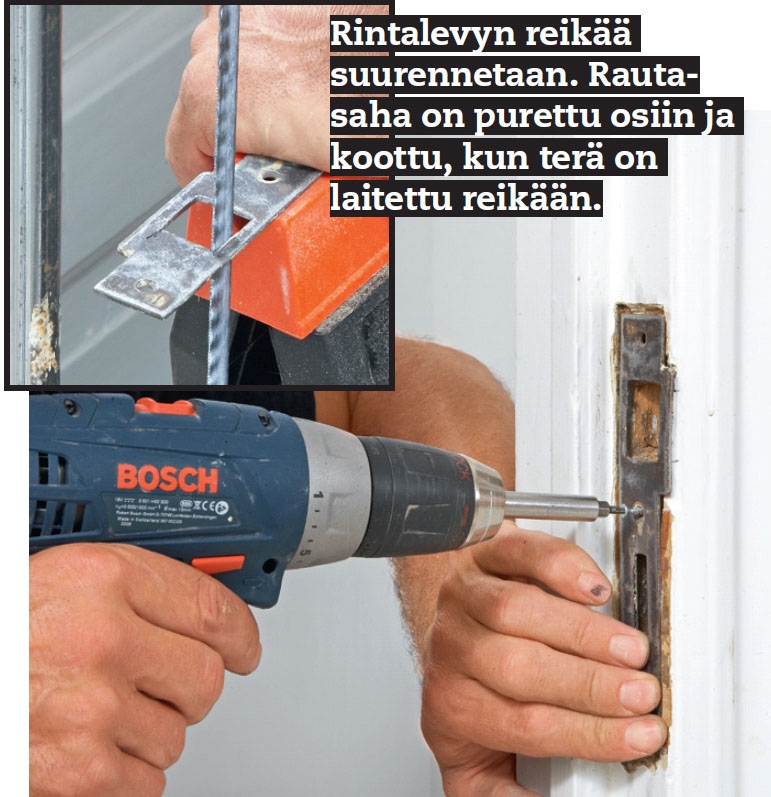 Nyt ovi on saranoilla, ja kaikki osat sopi-vat hyvin toisiinsa lukuun ottamatta karmin vastakappaletta ja oven telkeä. Telki on nimittäin suurempi kuin van-hassa ovessa, joten rintalevyä pitää sovittaa. Jotta rintalevyn rei’istä saadaan suuremmat, irrotamme rautasahasta terän ja asennamme sen takaisin, kun se on asetettu reikään. Nyt voimme sahata reikää hieman isommaksi.