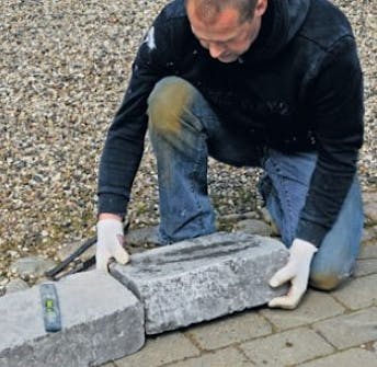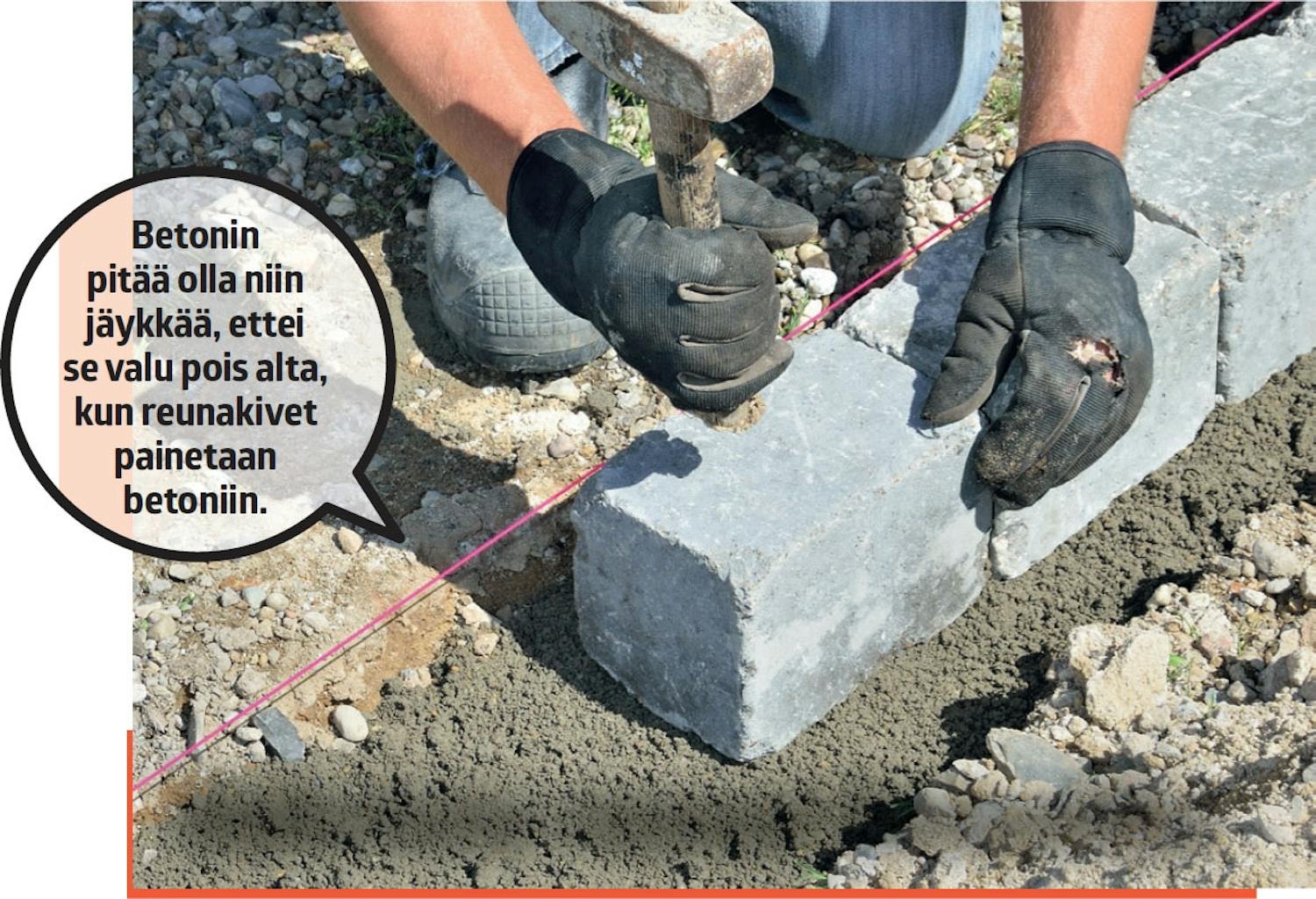 Paina seuraavat reunakivet betoniin. Lyö kivet paikoilleen. Tarkista, että kivet ovat yhtä ylhäällä. Tarkista myös, että reunakivien väliin mahtuu kartanokivi.