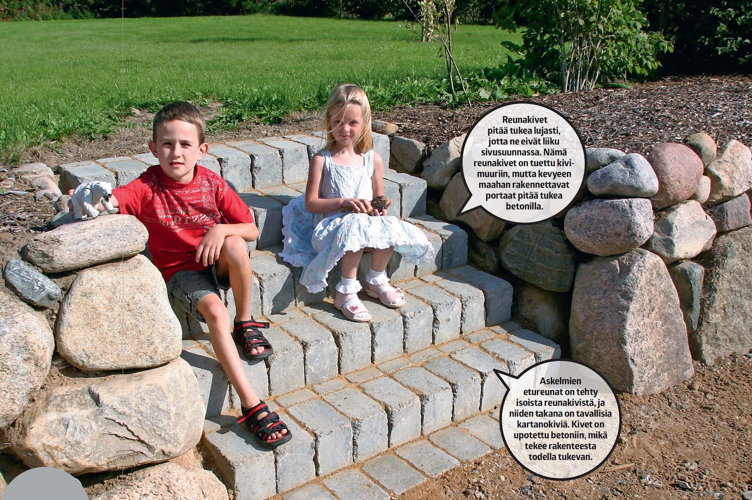 Portaista tulee todella kestävät, kun askelmat tehdään pystyyn nostetuista reunakivistä. Reunakivet toimivat sekä askelmien välinä että niiden ulkoreunoina. Askelmista tulee tarpeeksi syvät ja mukavat kävellä, kun reunakivien taakse asennetaan yksi rivi kartanokiviä.