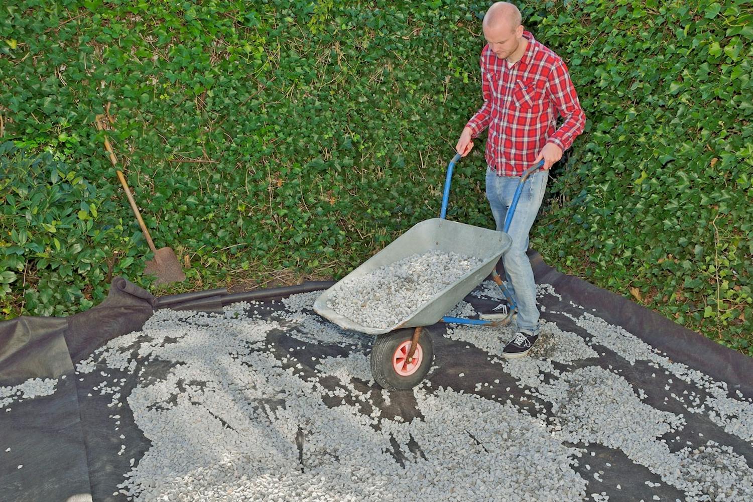Jos aiot käyttää aluetta vain kävelemiseen ja istuskeluun, kevyt työstö riittää. Kaiva nurmikko pois. Tasoita maa haravalla, levitä siihen vahva suodatinkangas ja suodatinkankaan päälle kerros kivimursketta. Näin korvaat nurmikon helpolla ja edullisella päällysteellä, jota ei tarvitse huoltaa.