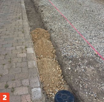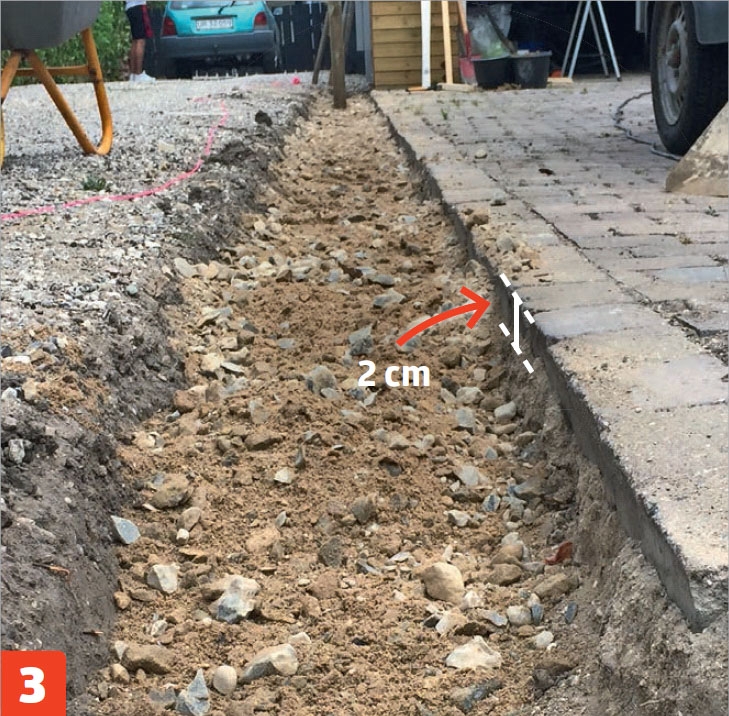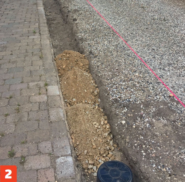Kaiva pihateiden väliin aluksi kouru ja lapioi sen pohjalle mursketta. Kovaksi painuneen pihatien kaivaminen voi olla vaikeaa, joten poravasarasta on apua pinnan rikkomisessa. Tiivistä murske perusteellisesti tärylevyllä.
