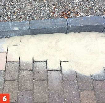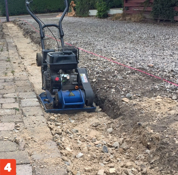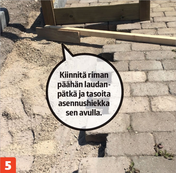 Tiivistä murske. 80 kilon tärylevy on välttämätön murskeen tiivistämisessä. Tiivistämisen jälkeen murskeen päälle mahtuu noin 4-5 senttiä asennushiekkaa.