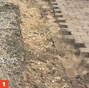 Irrota pihakivet. Kuvassa näkyy, kuinka kauas vanha pihakiveys ulottui. Irrota reunimmaiset kivet koko pihatien matkalta. Muista poistaa myös vanha saumahiekka.