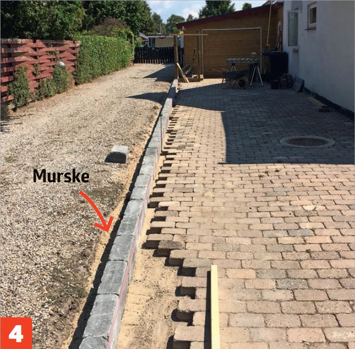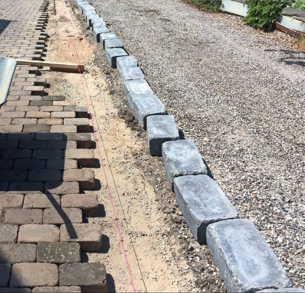 Kouru on nyt kaivettu ja täytetty, ja pihatielle on tehty uusi reuna. Nyt on aika asentaa betonireunakivet ja viimeistellä työ. Betonireunakiviä ei valeta maahan, vaan ne tuetaan murskeella naapurin pihatietä vasten. Pohja tiivistetään huolellisesti tärylevyllä.