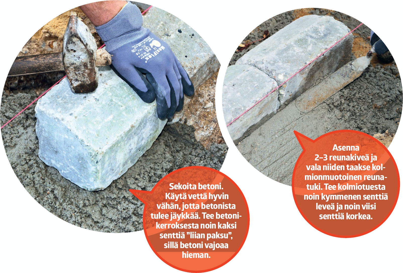 Asenna reunakivet linjalangan mukaan. Jätä reunakivien ja linjalangan väliin sentin levyinen rako. Älä paina kiviä kiinni lankaan.