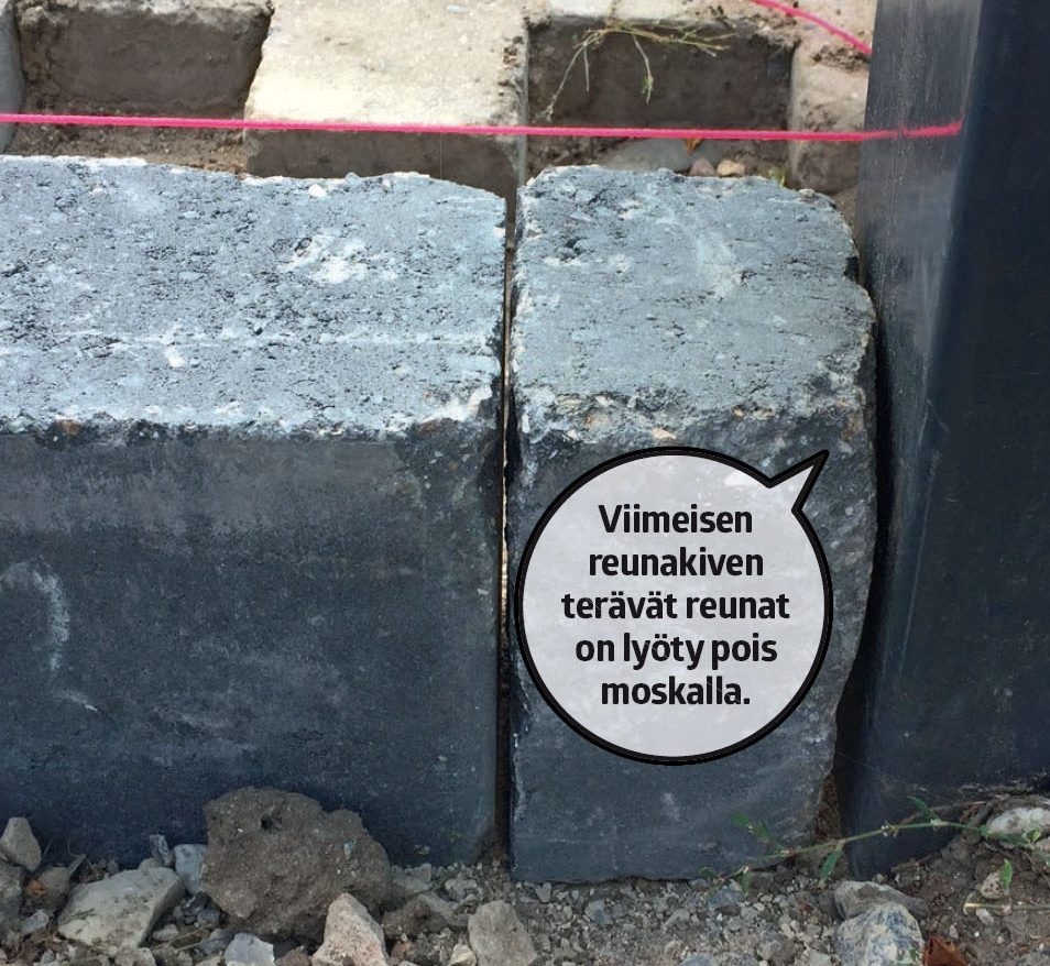 Leikkaa viimeinen reunakivi sopivaksi. Viimeinen reuna kivi osuu lyhty pylvääseen. Kivi sahataan poikki kulmahioma koneella ja timantti laikalla. Lyö kulma hiomakoneen tekemät terävät nurkat pois moskalla.