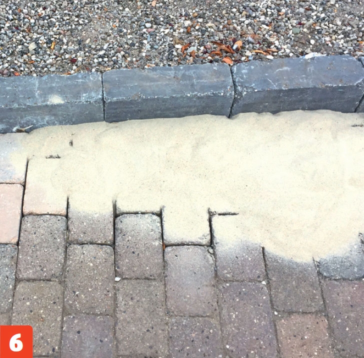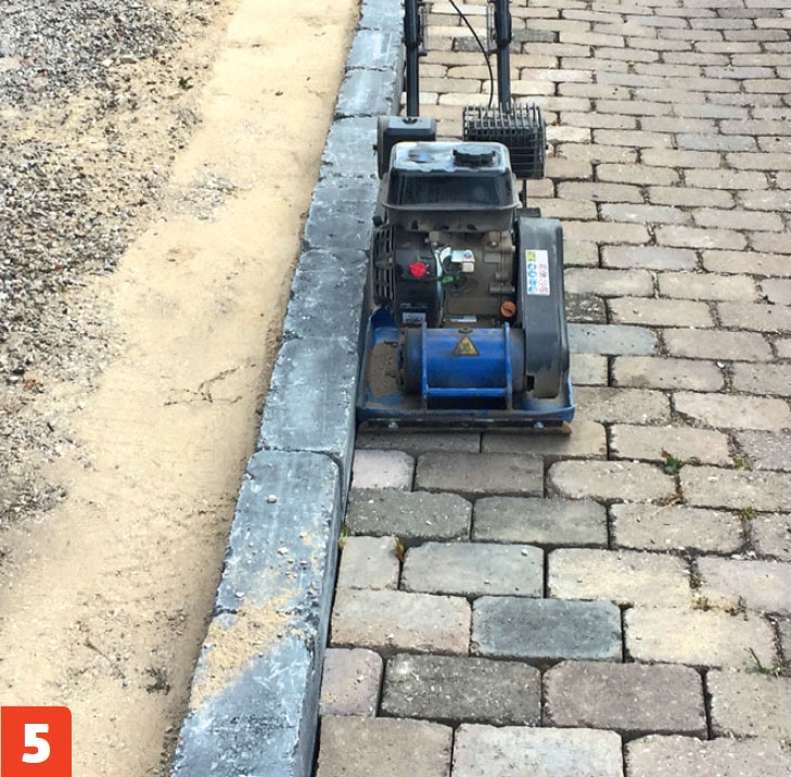 Tiivistä kivet paikoilleen. Pihakiveystä on nyt jatkettu reunakiviin asti. Aja kiveyksen yli pari kertaa tärylevyllä.