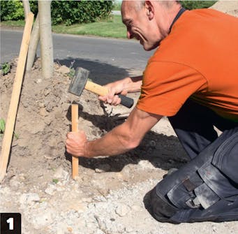 Tässä näytetään, miten asennat kiveykselle pyöreitä betonirenkaita. Niitä on helppo korostaa latomalla niiden viereen pieniä noppakiviä. Kivien leikkaamiseen kannattaa vuokrata iso kulmahiomakone.