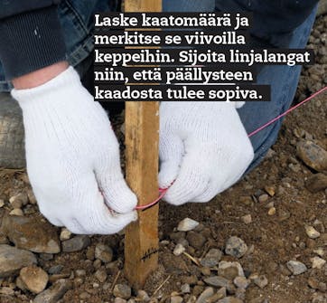 Autopaikan koko mitataan ja merkitään kepeillä jokaisesta kulmasta. Keppien väliin kiristetään linjalanka. Näin alueelle saadaan suorat reunat. Niiden mukaan voidaan kaivaa ja työstää kouru, johon reunakivet asennetaan. Kourun pitää olla niin syvä, että siinä on tilaa maakostealle betonikerrokselle, jota tarvitaan kivien pitämiseksi paikoillaan.