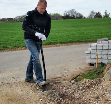 Kantava murskekerros pitää tasoittaa niin, että se on mahdollisimman tasainen ja sopivan korkea. Nyt emme voi käyttää putkia ja ohjainlautaa, sillä alustaa on jo käytetty ajotienä, ja se on tämän takia liian kova. Käytämme siis lapiota.