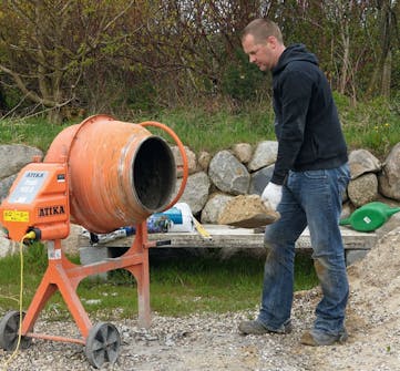 Sekoita maakosteaa betonia kuivabetonista ja sementistä. Käytä mielellään betonisekoitinta. Betonista pitää tehdä niin jäykkää, että reunaharkot voidaan asettaa siihen ilman, että seos valuu yli.