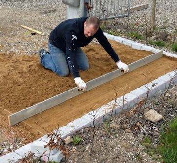 Tasoita nyt asennushiekkakerros ohjainkiskolla. Voit käyttää myös pitkää, suoraa lautaa. Vedä ohjainkiskoa siksakkia hiekkakerroksen yli, jotta saat pinnasta täysin tasaisen päällystettä varten.