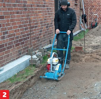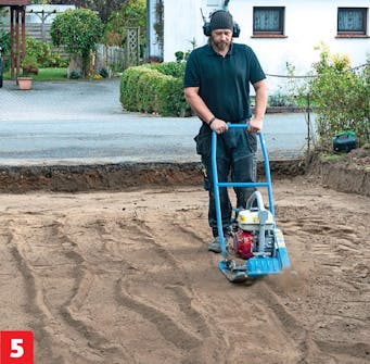 Tiivistä murskeen ja mullan sekoitus tärylevyllä. Joudut tekemään sen monta kertaa, sillä tärylevy ei pysty tiivistämään koko 30 sentin kerrosta yhdellä kertaa.