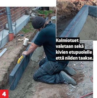 Levitä reunalle betonia. Massan pitää olla niin kiinteää, etteivät kivet vajoa siihen. Voit tehdä kivien molemmille puolille kolmiotuet. Tarkista korkeus linjalangalla.
