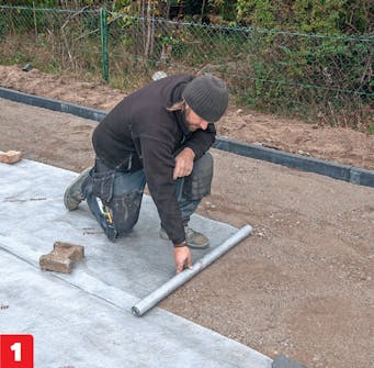 Levitä murskeen päälle vettä läpäisevä kuitukangas. Kun kangas on paikallaan, kaada sen päälle 4-5 sentin kerros asennushiekkaa. Sekoita hiekkaan multaa suhteessa 3:1. Kuitukangas estää asennushiekkaa katoamasta murskeen sekaan.
