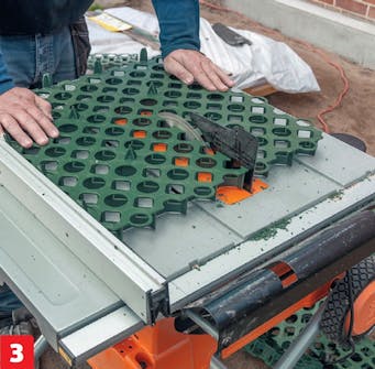 Reunakivien viereisen reunan pitää olla suora. Mattoa on helppo leikata pöytäsirkkelillä. Muista leikata oikeasta reunasta, jotta et leikkaa pois lukitusta.