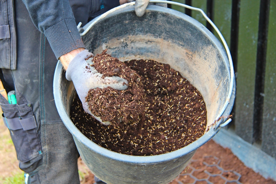 Levitä mursketta noin 10 senttiä paksu kerros ja sekoita siihen multaa suhteessa 3:1. Haravoi ja huuhtele multa kivien väliin ja tiivistä kerros tärylevyllä eli lätkällä. Lisää mursketta ja multaa kerroksittain, mutta jätä pinnalle 10 senttiä tilaa ruohokennoille.