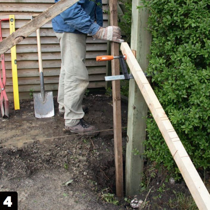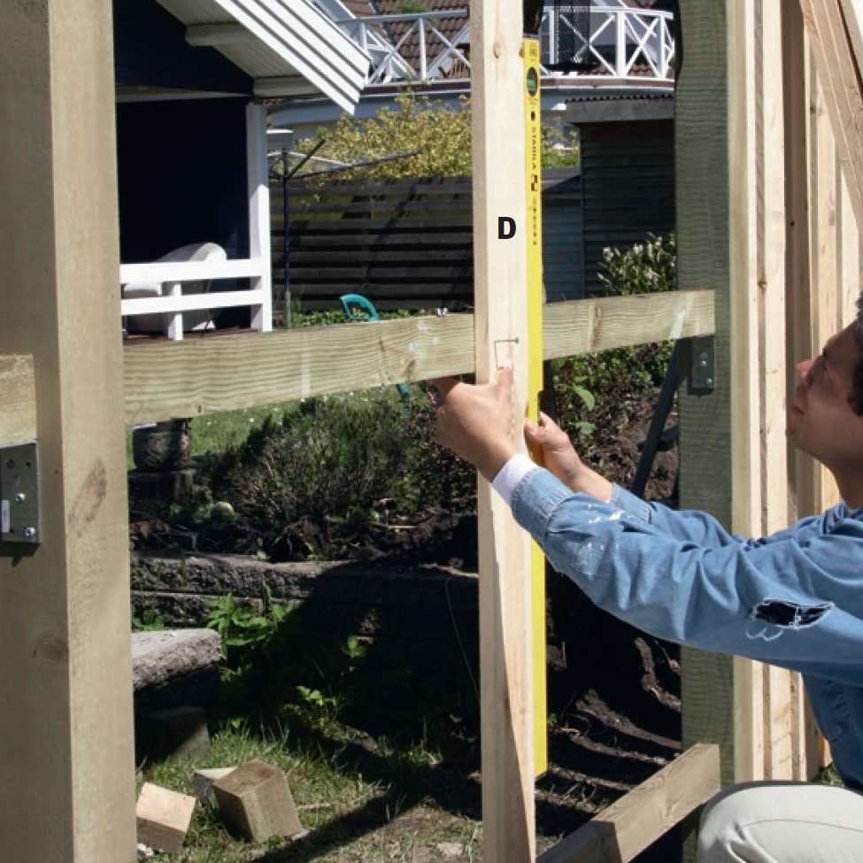 Kiinnitä koolausrimat väliaikaisesti tolppien ylä ja alapäähän. Siten tolpat tulevat yhtä kauas toisistaan ja tolpat pysyvät suorassa. Tue tolppa sivusuunnassa laudalla, joka nojaa maahan upotettuun keppiin. Sen jälkeen tolppa on helppo hienosäätää suoraan.